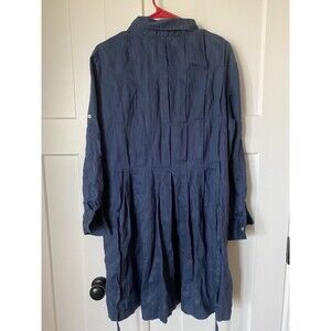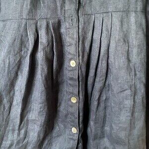 Hammock & Vine tunic/dress, NWOT, women’s 12, 100% linen. Dark blue, button-up, collared, convertible sleeves for long or 3/4 length with iridescent shell buttons, floral embroidery on chest, side slit & high-low hem, back pleating & waist ties, machine wash or dry clean, extra button included. One missing button at waist.
