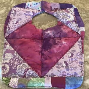 NwOT. Hand crafted from all new 100% cotton fabrics and made in a smoke-free home. This beautiful bib is really 2 bibs in 1 - one side features purple and fuschia batiks and prints while the other side features a greens leaf print on a purple background. Velsco fastener.