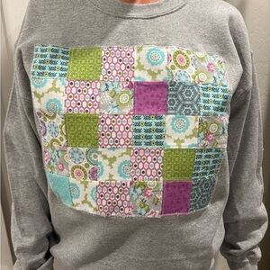 NWOT Hand Crafted gray sweatshirt with quilted patch