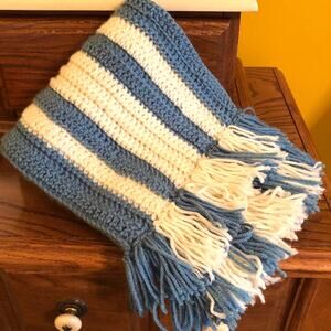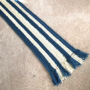 NWOT Handmade Blue and Cream Crocheted Striped Fringe Scarf