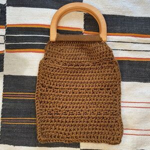 This NWOT handmade crochet handbag features wooden handles and a boho, hippie-inspired design in brown. The small satchel/top handle bag is made with acrylic exterior material and adorned with crochet accents, embodying a retro bohemian theme perfect for eco-conscious fashionistas. Handcrafted in the United States, this unique handbag adds a touch of craftsmanship and character to any outfit.
