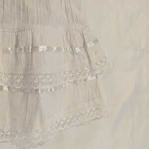 This beautiful baby dress was purchased in Romania and features the country's traditional folk designs and embroidery. Most of the dress is made of a thick, gauze-y material that feels like it's been starched, but would soften after washing. The bodice is decorated with embroidered flowers and leaves. The skirt part of the dress has a pretty flounce and is trimmed with ribbon and lace. The straps and neck of the dress are made of crochet and decorated with crochet flowers. There is also a very delicate, white-ribbon bow at the neck that can be adjusted for fit.
