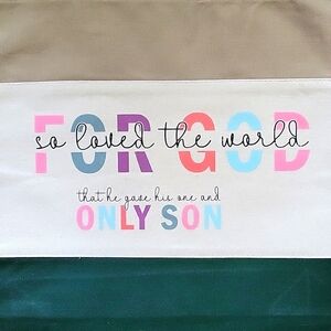 NWOT Handmade "For God so loved the world, that he gave his one and only Son" color block Tote Bag, 100% Heavy Cotton Canvas. 20" webbed handles with a 8" drop. Measurements are 15" X 15" 3". Never been used. Made to order, please allow 1-3 days to ship. Smoke and Pet free home.