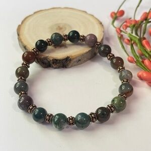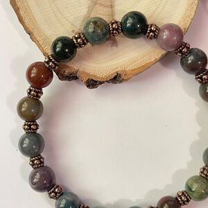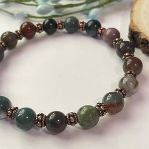 This Indian agate protection bracelet is handmade with 10mm Indian agate stones and antiqued copper beads on elastic cord.