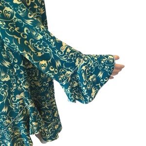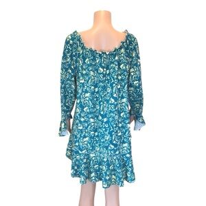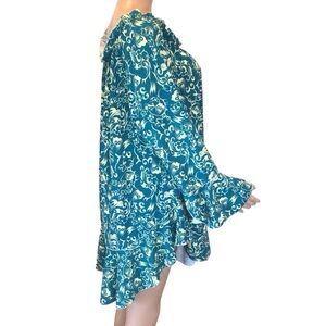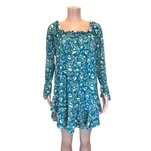 Versatile off/on shoulder teal and white printed piece by Hannah Closet. Can be worn as a mini dress or tunic top. Flowy long sleeves and a relaxed fit make it perfect for summer days, vacations, or casual chic style.