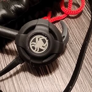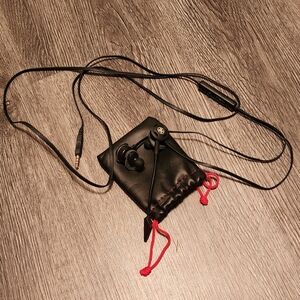 Sleek black wired earbuds/headset with a microphone and convenient pouch. Perfect for giving presentations or listening to music on the go.