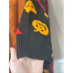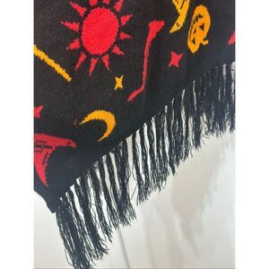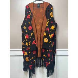 Serve up some Dani Dennison sass with this flyaway cardigan from Disney's Hocus Pocus. Inspired by her Halloween witch costume, there is an allover orange & red icon design featuring pumpkins, cats, suns, brooms and more! The front drapes just like a witch's cloak and there is a pointed hood, complete with fringes along the hems.