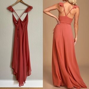 Lulus Here's to Us Rose High-Low Wrap Dress! Breezy woven chiffon sweeps over a sleeveless wrap bodice with adjustable spaghetti straps, modified racerback, and tying waist sash. High-low midi skirt has a front slit and rounded hem.