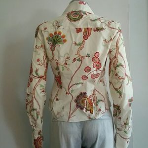 Cream-colored shirt with organic print in reds, pinks, greens. Darting in front and back for a tailored fit.