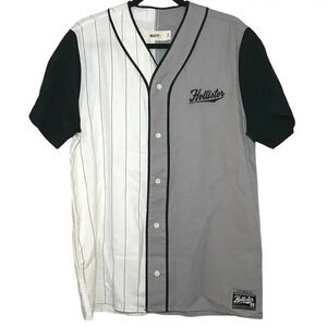 Hollister baseball jersey shirt size medium. Gray, white and black color block pattern with pinstripe accents. Button down crew neck with Hollister written in relaxed cursive in left side of chest. 55% cotton and 45% viscose. Brand new without tags! Measurements: length- 29 inches and Chest (underarm to underarm)- 21 inches.