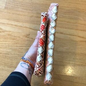 Both brand new. Never used. NO TAGS. They never had tags. They were bought from a Boutique. We brought them back from a trip to Europe. Zipper closures. Super cool bags.