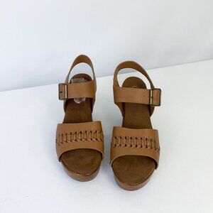 These stylish Cliff by White Mountain sandals come in a warm honey tone with a wood-look sole. Made from soft synthetic leather, they feature a platform and chunky heel that add height without sacrificing comfort. Perfect to pair with summer dresses, wide-leg jeans, or linen pants for a retro-inspired look. Condition: New without tags (original price $65) Estimated size: US 5 Measurements: Insole length: 22.5 cm (8.86") Heel height: 10.5 cm (4.13") Platform height: 3 cm (1.18")