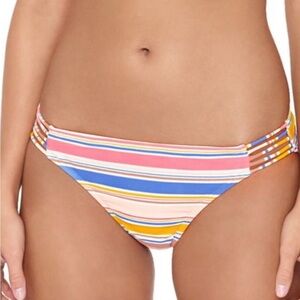 The striped swim bottom features multiple straps on sides. Made of nylon/spandex/ polyester. Covered elastic along waist and leg openings for an instant fit. Five covered elastic straps on sides. Mid rise.