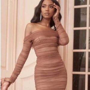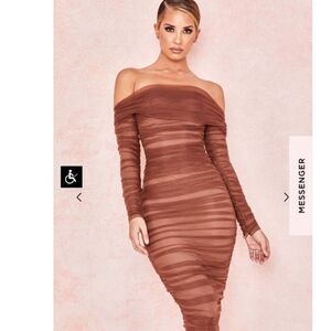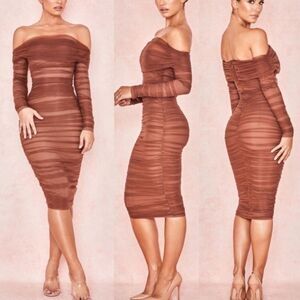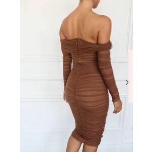 NWOT House of CB London Anais Brown Tulle Off Shoulder Ruched Dress XS
