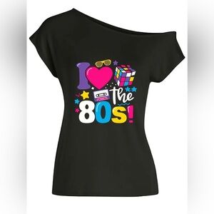 I Love The 80's Womens Bubble Letter Cube Toy Off the Shoulder T-Shirt. Brand new in original packaging. Never worn. From smoke free home.