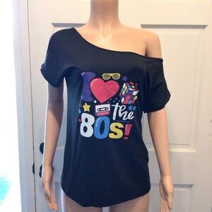 NWOT I Love The 80's Womens Bubble Letter Cube Toy Off the Shoulder T-Shirt
