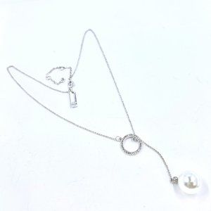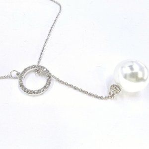 NWOT – INC International Concepts – Faux Pearl Pull through Silver Tone 16” Necklace. Necklace is shiny silver tone and the pull through ring is jeweled with rhinestones and is 5/8” in diameter. The extender chain is 3” long, and the necklace is signed INC. The faux pearl is .5” in diameter and has a jeweled bead cap. Necklace is new without tags and is from overstock or liquidated merchandise. Necklace is in great condition.