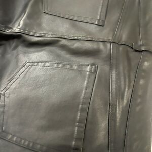 Sleek faux leather straight leg design. New without tags. Bought from Macy’s for an event and never wore them. Size Large. Inseam measures 27”. Laying flat waist measures 15” so 30” in diameter.