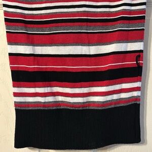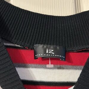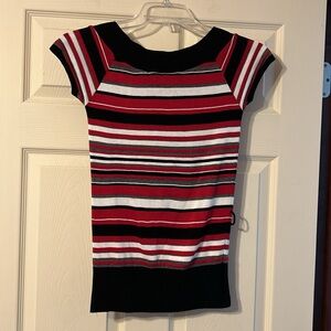 IZ Byer Black, Red, White, & Grey striped boat neck light weight sweater. Has thin belt holder on each side. Short sleeve. New without tags from a smoke free home. Juniors size small. 95% acrylic 5% spandex. Armpit to armpit is 14 inches. Back of neck to bottom is 24.5 inches long.