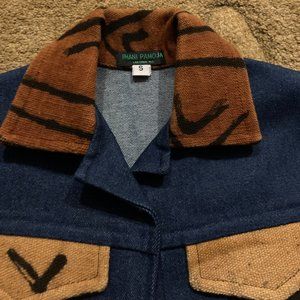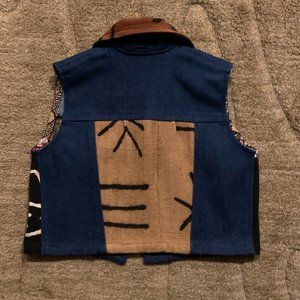 Unisex vest fabric is a mix of 100% denim, authentic mudcloth, and 100% African cotton fabric. Brown mudcloth collar. 4 snaps up front. Armpit-to-armpit is 15.5", shoulder-to-waist is 14. Excellent condition. Dry cleaned. Smoke/pet free home.