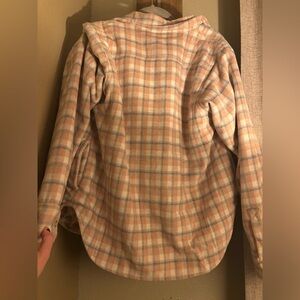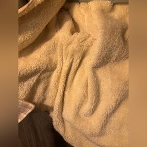 Gingham plaid flannel fleece pink blue and cream with inner soft Sherpa lining. Button closure slightly oversized and cozy with thicker lining.