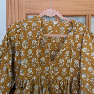 This dress is unbelievably cute but it's just not my style, never worn but has been washed! Beautiful mustard color and floral block printed pattern. No brand on the tag, was purchased from Divyanshhandicrafts on Etsy. 100% Cotton.