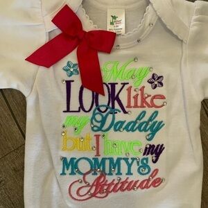 Monogram saying "I may LOOK like my Daddy but I have my MOMMYS Attitude." Accented with studs and pink bow at collar which has been stitched on to hold more secure.