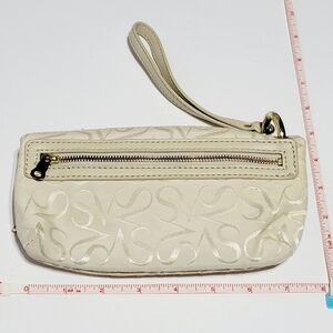 NWOT Ivory Brocade Wristlet Clutch with fold over magnetic closure and zipper. 2 other Zippered Pockets: 1 outside and 1 inside. Never used. Protective coating still on label.