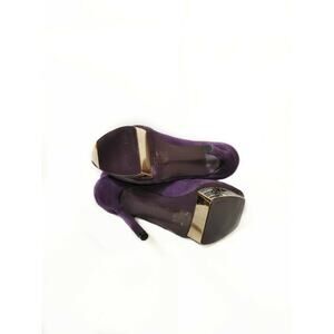 New without tags Ivy Kirzhner purple suede platform stiletto ankle booties. Curved split shape that goes higher in back. Geometric purple & gold metallic 1" platfrom in front. 5" stiletto heel. Slip on. Light scuff on side and sole from storage but never worn. Stunning unique shoe.