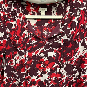 NWOT J. Crew Dark Poppy Printed Tie Neck Blouse in size S. Excellent new condition. Long sleeve with button detail on sleeve, sheer flowy fabric, rounded hem, style E4505. Please see photos for approximate measurements and details. Item may show difference in color based upon photography and perception. Photos are part of the description, as everyone’s level of condition may vary. From smoke free and pet free home. All packages are shipped the same or next business day.