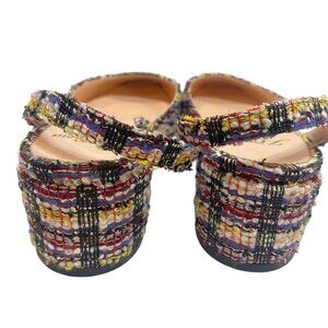 The J. Crew Tweed Slingback Block Heel Sandal is a stylish and versatile slip-on shoe for women in size 9. Made with a multicolor tweed upper material, this sandal features a slingback style with a block heel, making it perfect for a variety of occasions such as parties, casual outings, christenings, workwear, and business settings. Its classic design and quality construction from J. Crew make it a standout choice for any wardrobe.