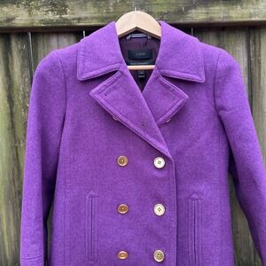 J Crew double breasted peacoat in a vibrant purple hue. This stylish coat features a classic notched lapel, gold-toned buttons, and sleek pocket details. The rich wool cashmere blend offers warmth and a luxurious feel. Perfect for adding a pop of color to your fall and winter wardrobe or for a chic evening out.
