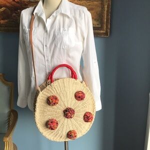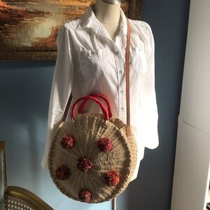 NWOT J. Crew colorful round straw pom pom crossbody circle tote hobo boho bag