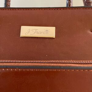 NWOT J Francis Brown satchel bag with crocs embossed print on sides & straps has a detachable shoulder strap front zipper back zipper top zipper the inside lining has a zipper compartment a side zipper two side pockets see all pictures any questions please message
