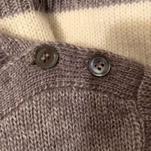 J.Crew Striped Boatneck Sweater with 2 buttons on each shoulder Color: Gray/Cream 50% Acrylic, 40% Wool, 10% Mohair Length is 26-1/2" from the top of shoulder to the bottom. Width is 19-1/2" from arm pit to arm pit. Style #35387 Excellent "NWOT" Condition! Never worn!