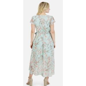 Garden-inspired florals enliven this soft chiffon maxi dress designed with a wrap silhouette, flutter sleeves and an asymmetric hem. Short flutter sleeves. Asymmetric hem.