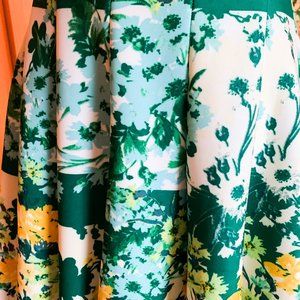 NWOT Sleeveless above the knee flared summer dress by Julien Taylor. Colors are light and dark green, and bright yellow against off white background. Made of wrinkle free polyester and spandex. Weight is 13.2oz. Fitted bodice and flared skirt make a flattering ultra comfortable fit. 28" back gold visible zipper. Unlined. Machine wash in lingerie bag gentle cycle, hang dry. PERFECT: No snags, tears, holes, stains, discoloration, stuck zipper, stretched seams, loose threads, pilling, odor