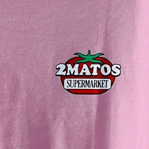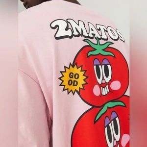 Brand new, never worn. This is an oversize T-shirt with a straight cut, can be worn by men and women. The big tomato graphic is on the back and there is a tiny one on the front. Length 29”. Pit to pit 22”.