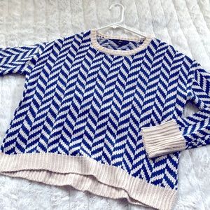 Bright blue chevron pattern makes this a fun and eye-catching addition to your closet! Crewneck with an easy fit. Side slits.