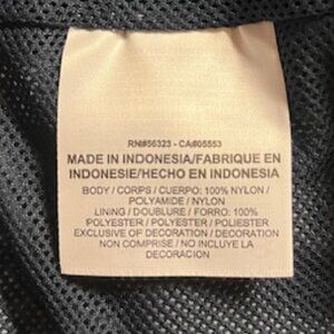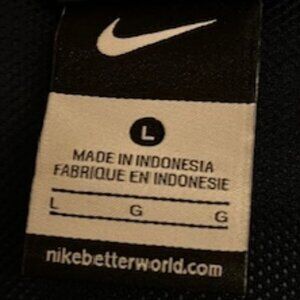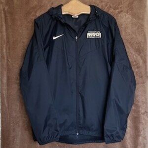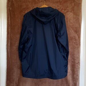 Nike Navy blue hooded jacket in perfect new condition with side pockets and adjustable hood and hem (slightly longer in back for greater coverage). Size L measures 29 1/2" long in front/ 31" back, 24" armpit to armpit with 27" sleeves. Nylon with polyester lining.