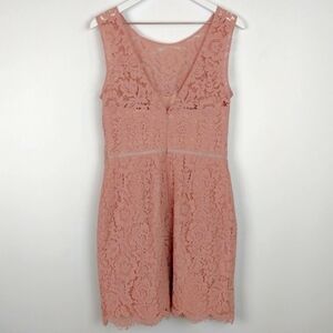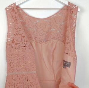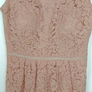 NWOT Jenny Too Collection blush pink floral lace sheath dress. Women's size 10. 36.1% nylon 20.2% cotton 43.7% nylon with a 100% polyester lining. This dress is sleeveless, that zips closed in the back, and has a padded bust and a sweetheart neckline overlaid with beautiful floral lace.