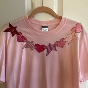 New without tags. Jerzees brand cotton and polyester blend women’s size medium pink tee short, round collar and short sleeves. Soft pink with shades of reds and pinks hearts and stars decorations around front neckline and carried over to left back shoulder as well. Jerzees HeavyWeight blend. Showing photos of front and back sides along with fiber contents and care information.