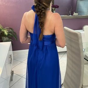 This gorgeous dress is so beautiful. It’s royal blue, halter in back. Gown to the floor., model does not have shoes on. Sleeveless. NWOT