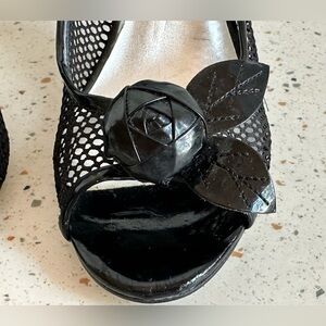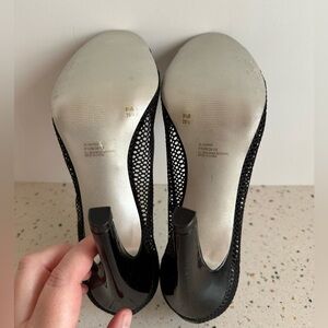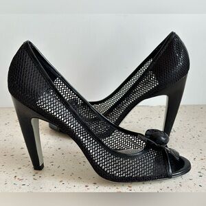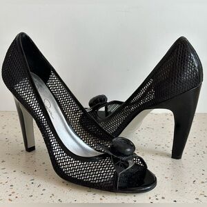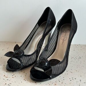NWOT Jessica Simpson Black Fishnet High Heels with Flower Peep Toes