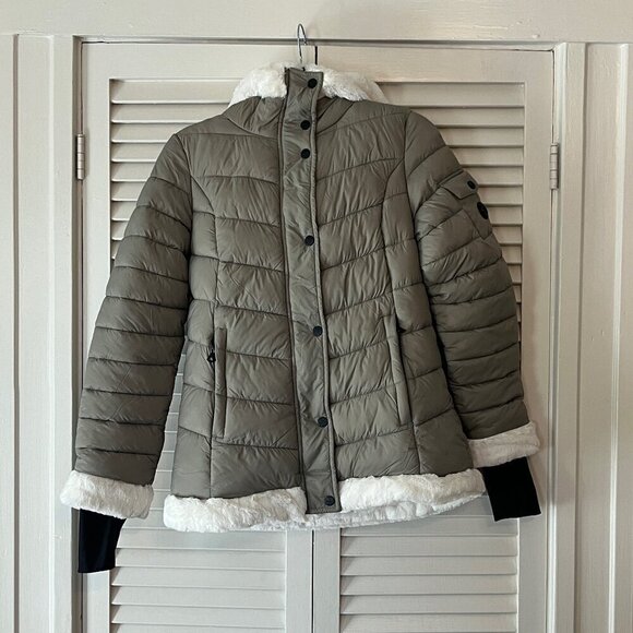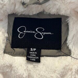 Jessica Simpson women's hooded puffer parka jacket, size small. Grey color with greenish undertones, with white fleece trim. New without tags. No rips or stains.