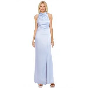 NWOT Jewel Badgley Mischka Sky Blue Satin Daley Halter Neck Gown Size 14