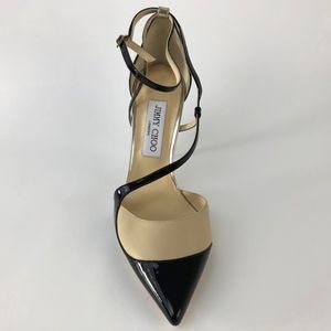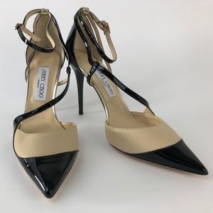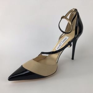 NWOT Jimmy Choo two tone nude and patent black leather sandal with gold detail down back of heel, pointed toe, never worn, still has price tag on bottom, 4" heel