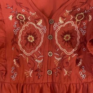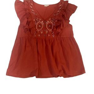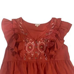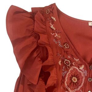 NWOT Jodifl Burgundy Rust Colored Ruffle Top with Multicolored Embroidered Flowe