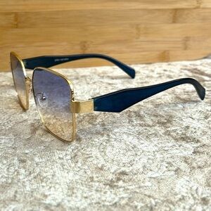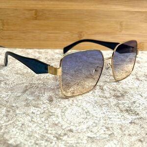 NWOT John Varvatos Square Frame Gold Tone Rim Sunglasses. Blue/Yellow Gradient Lens w/ Dark Blue Arms.