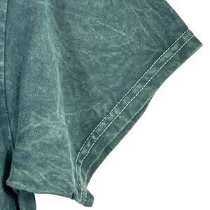 This is a classic, 100% cotton short sleeve tee in dark gray-green mineral wash with the Johnny Cash logo and guitar graphic with the words, "The Man In Black Original American Outlaw" in cream. Short sleeves; 100% cotton.